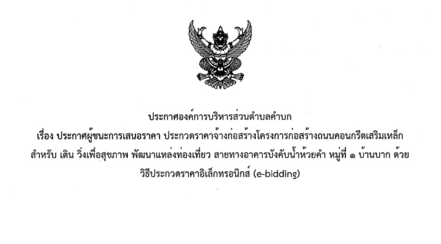 ประกาศผู้ชนะ ประกวดราคาจ้างก่อสร้างโครงการก่อสร้างถนนคอนกรีตเสริมเหล็กสำหรับ เดิน วิ่งเพื่อสุขภาพ พัฒนาแหล่งท่องเที่ยว สายทางอาคารบังคับน้ำห้วยคำ หมู่ที่ 1 บ้านบาก ด้วยวิธีประกวดราคาอิเล็กทรอนิกส์ (e-bidding) (เลขที่โครงการ : 67109193601)